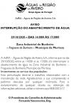 Devido a trabalhos de manutenção da rede, será interrompido o fornecimento de água na 5ª feira 29/10/2020, entre as 14h-17h00, na Zona Industrial do Bunheiro. Após a reposição da normalidade do serviço, poderão existir algumas variações de pressão e de caudal, que também poderão originar episódios..